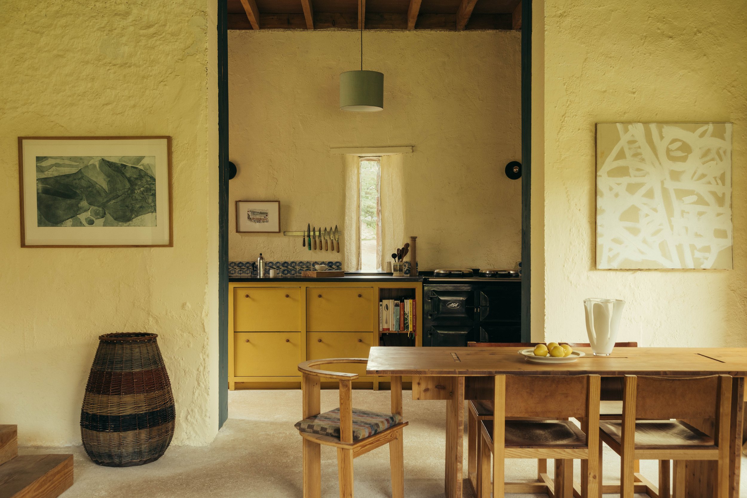 The clients had a limited budget but a desire to spend the money on natural, breathable materials where possible. It was agreed from the outset no new external openings would be formed to reduce cost but also to ensure the character of the old byre was retained. Works began with installing a new limecrete floor with under floor heating throughout, sitting on a bed of glapor recycled foam glass insulation. These products working together allow the floor to breathe and prevent rising damp in old buildings as well as eliminating the use of cement in the construction. On the walls we applied a 60mm coat of Diathonite natural cork and clay insulation which is sprayed directly onto the existing stonework. This provides a natural, breathable insulation suitable for a historic building whilst also achieving a regulatory compliant u-value. Aesthetically the cork plaster creates a rough textured wall surface that softly wraps around openings and undulations of the existing stone walls, which helps to retain the age and character of the building. The walls are finished with a coat of lime-wash to give a warm natural colour palette.